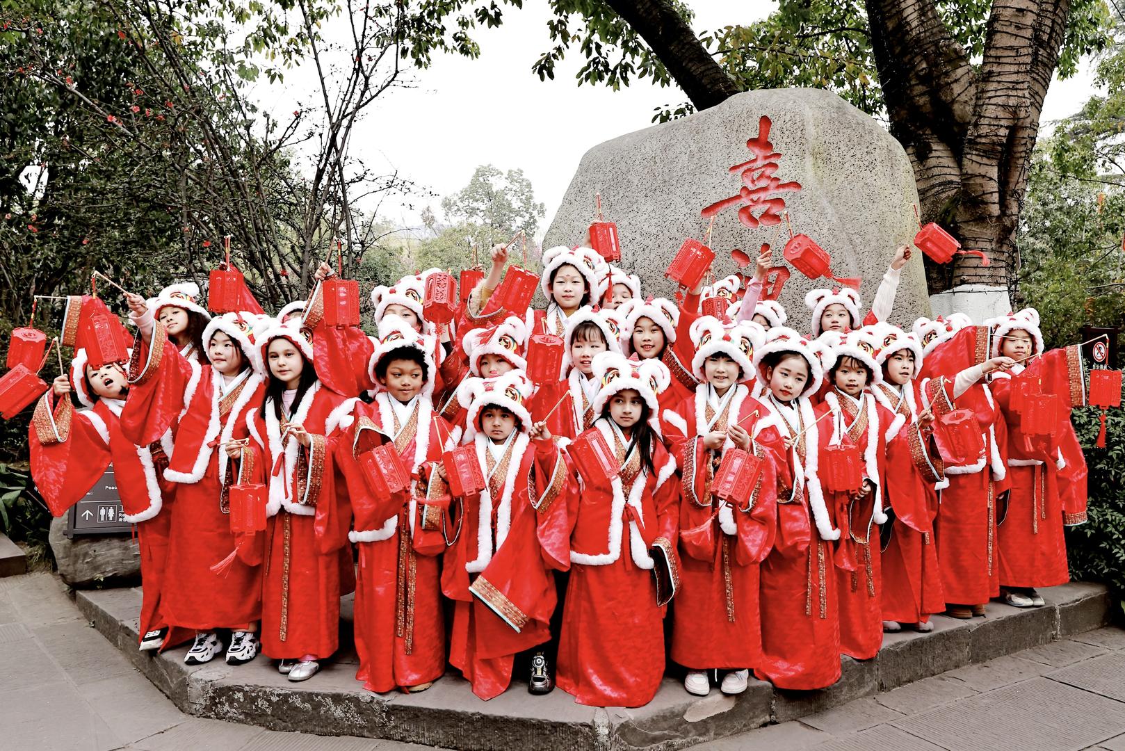 今年武侯祠成都大庙会的小喜神阵容空前——55位,可谓“含喜量”爆表。他们被分为“福星小喜神”“国际小喜神”“鸿运小喜神”三大类别,凸显出小喜神团队的丰富多元。