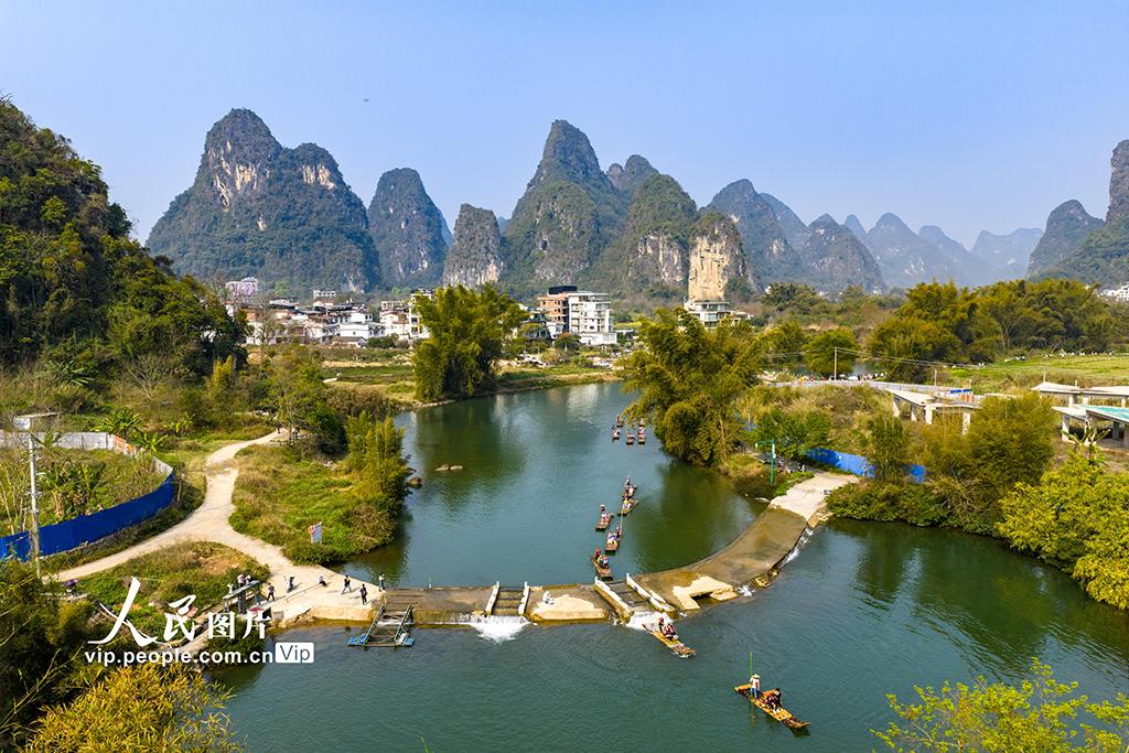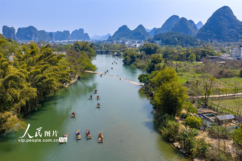 2026年3月14日,在广西桂林阳朔县,众多游客乘坐竹筏游览遇龙河股票股指配资,欣赏沿岸的山水风光。黄胜林摄(人民图片网)