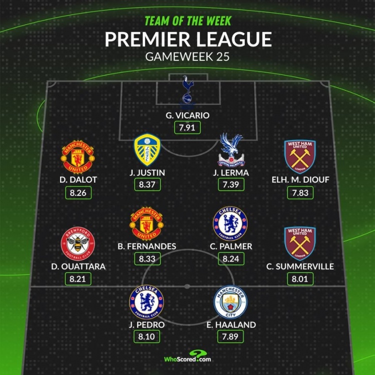 直播吧2月9日讯 英超第25轮已经完赛,whoscored也列出了本轮评分最佳阵容,曼联、切尔西、西汉姆各2人上榜。